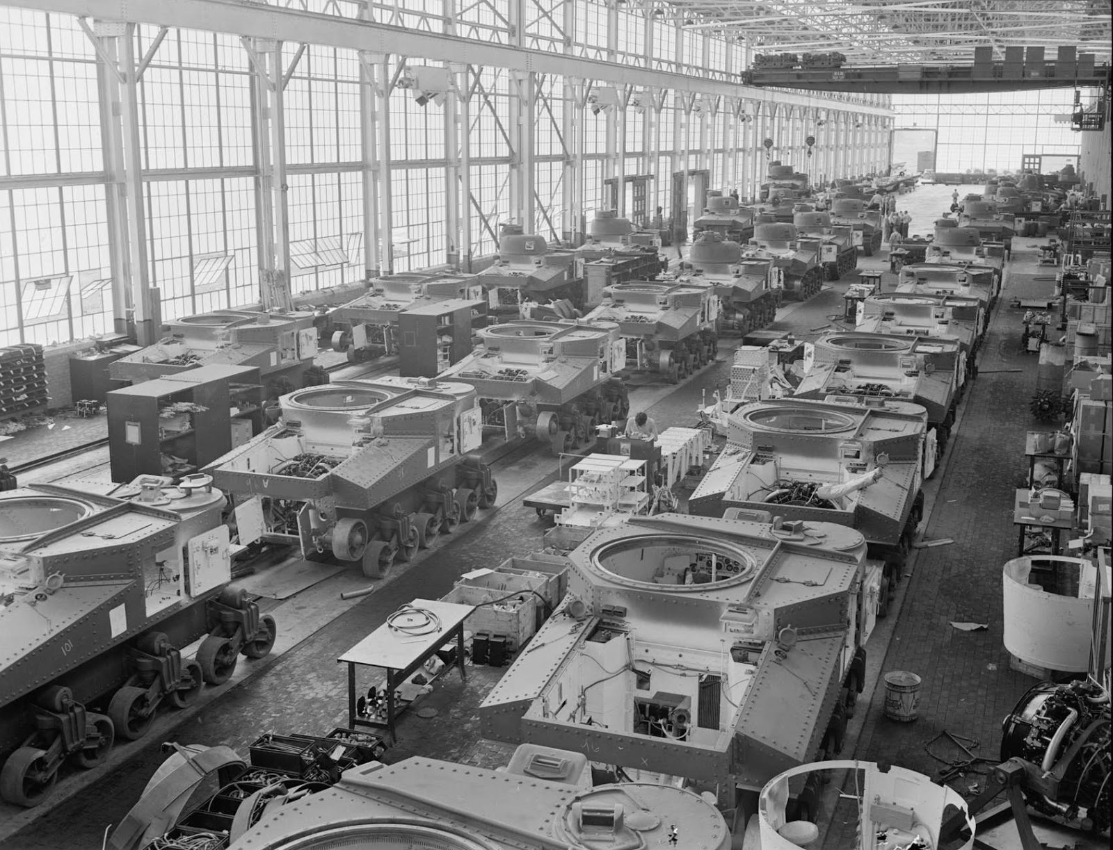 Faced with a crisis situation the US government and big business carried out a dramatic switch of production from civilian needs to war material. Within months production lines went from producing washing machines or cars to producing submachine guns and tanks (see photo above). Military production went from 2% of GDP in 1941 to 40% in 1943. Stringent rationing was introduced in whole number of areas (rubber, petrol, food, clothing, etc).
